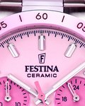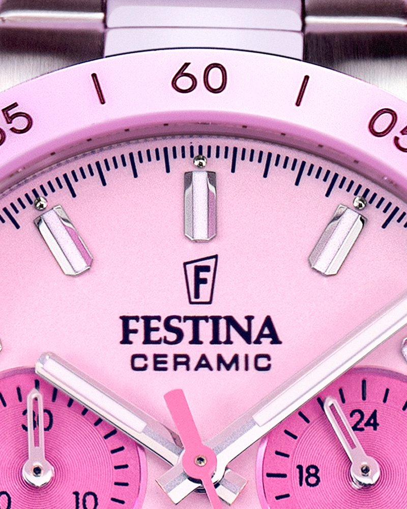 Dámské bateriové hodinky v klasickém stylu na ocelovém náramku s ocelovým pouzdrem o průměru 39 milimetrů s keramickou lunetou. Růžový číselník s ukazatelem času ve 24hodinovém formátu a stopkami je chráněn minerálním sklem. S vodotěsností 100 metrů jsou