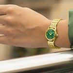 Dámské klasické bateriové hodinky s vodotěsností 50 metrů a minerálním sklíčkem. Ocelové pouzdro o průměru 23 milimetrů spolu s náramkem disponuje zlatou PVD úpravou a v kombinaci se zeleným perleťovým číselníkem tvoří ideální doplněk pro každodenní nošen