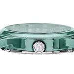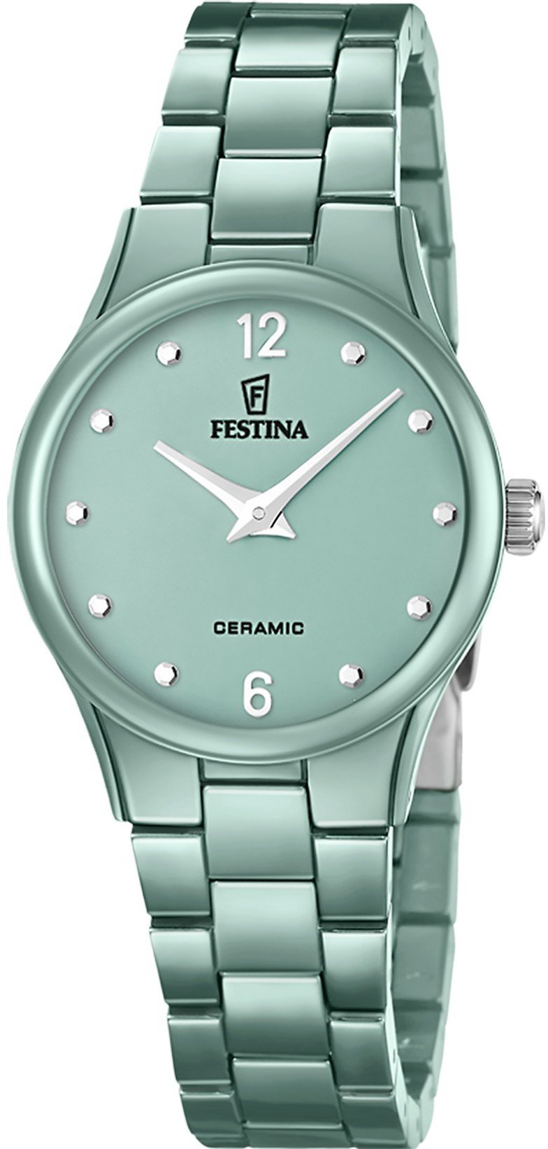 Dámské quartzové elegantní hodinky z keramiky v zelené barvě s minimalistickým číselníkem stejné barvy, který je chráněn minerálním sklíčkem. Pouzdro o průměru 30,5 milimetru má ocelové zadní dýnko a korunku, které ladí se sponou, indexy a ručkami. Hodink