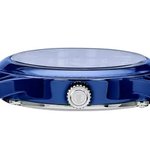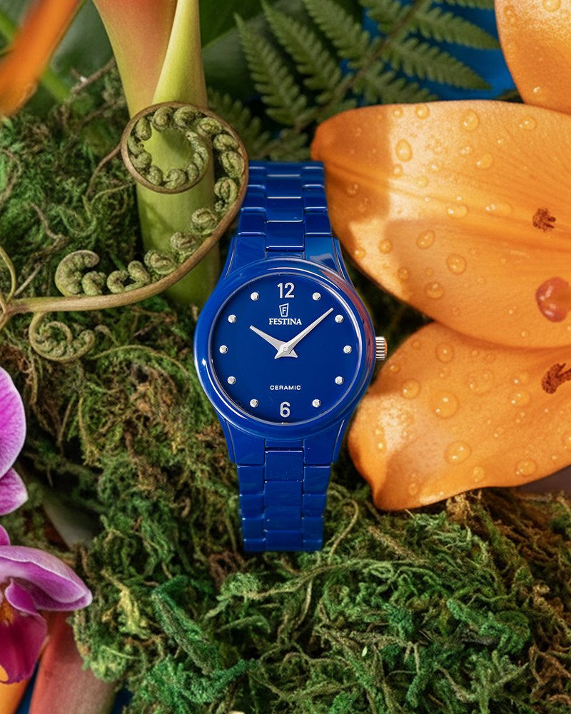 Dámské quartzové elegantní hodinky z keramiky v tmavě modré barvě s minimalistickým číselníkem stejné barvy, který je chráněn minerálním sklíčkem. Pouzdro o průměru 30,5 milimetru má ocelové zadní dýnko a korunku, které ladí se sponou, indexy a ručkami. H