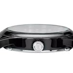 Dámské quartzové elegantní hodinky z keramiky v černé barvě s minimalistickým číselníkem stejné barvy, který je chráněn minerálním sklíčkem. Pouzdro o průměru 30,5 milimetru má ocelové zadní dýnko a korunku, které ladí se sponou, indexy a ručkami. Hodinky