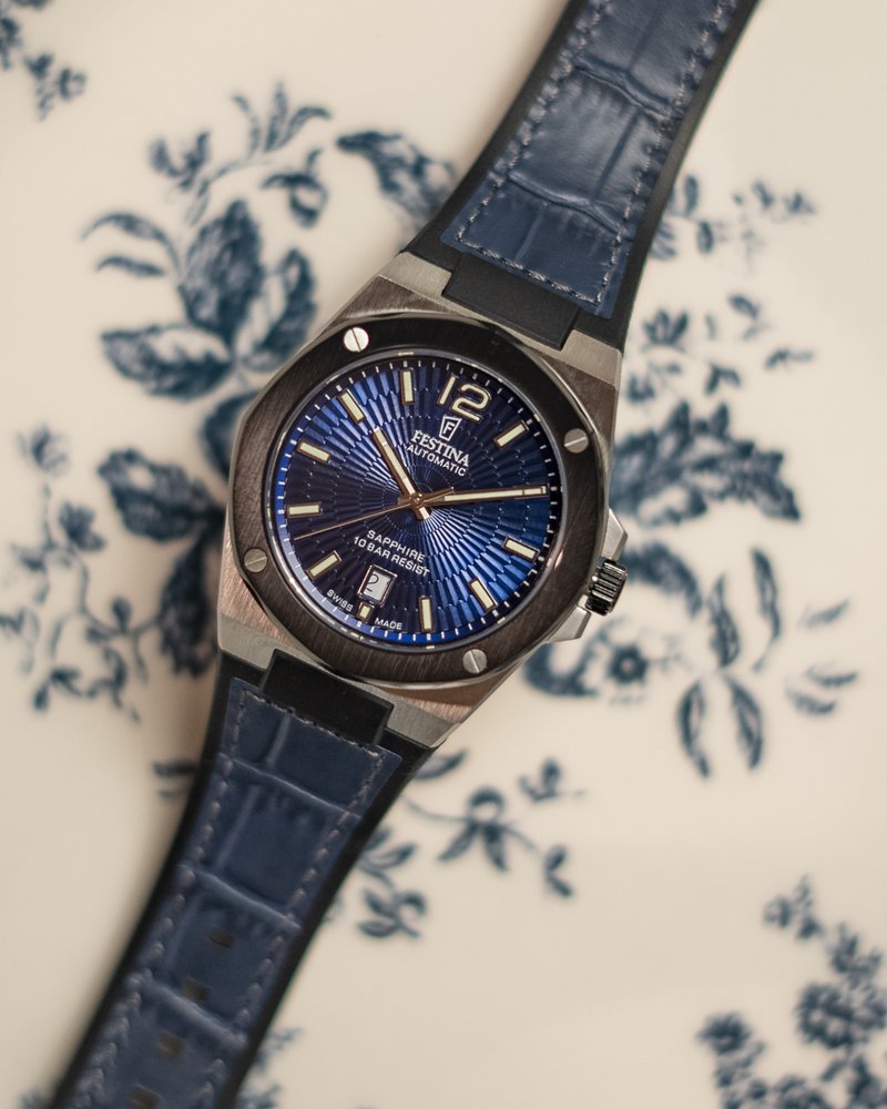 Pánské sportovní quartzové hodinky s ocelovým pouzdrem o průměru 42 mm a modro-černým řemínkem z kůže a kaučuku. Na modrém texturovaném číselníku, který je chráněn safírovým sklem, vynikají výrazné ručičky a indexy. Hodinky disponují indikací data a vodot