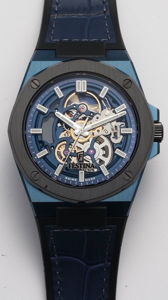 Pánské automatické hodinky na modro-černém řemínku z kůže a gumy jsou vhodné pro každodenní nošení. Modrý skeletonový číselník je chráněn odolným safírovým sklem. Hodinky disponují vodotěsností 100 metrů, luminiscencí a průhledným dýnkem. (F22011/1)