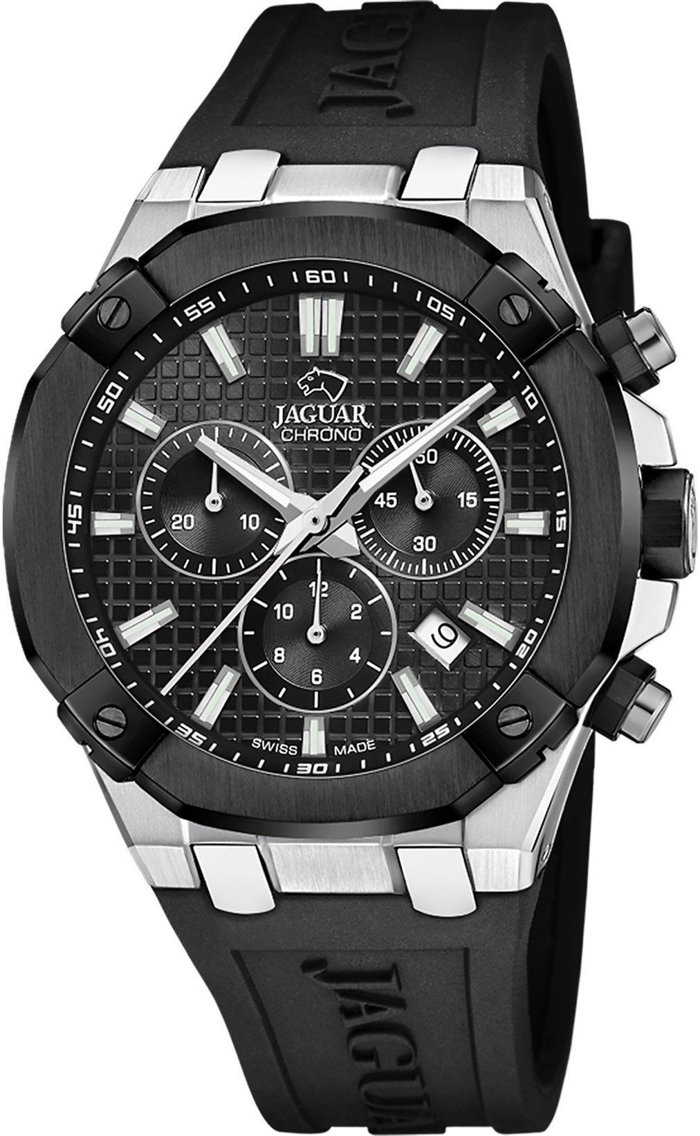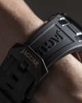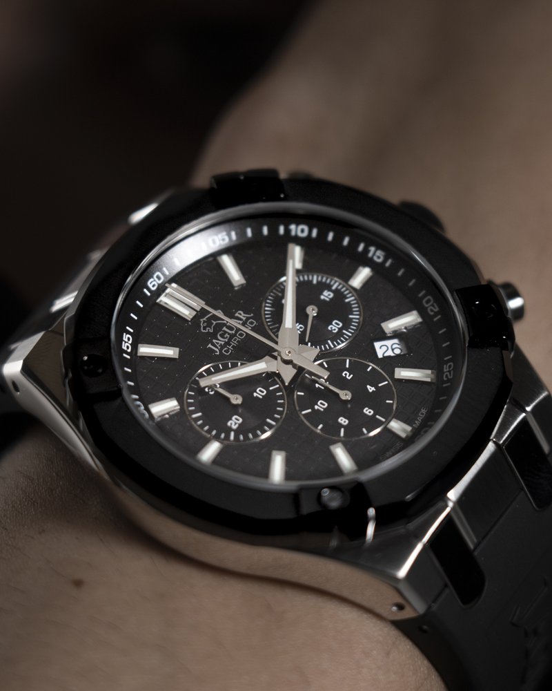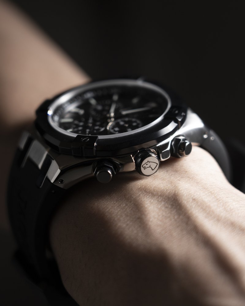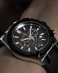 Pánské quartzové hodinky na černém kaučukovém řemínku s černým číselníkem a safírovým sklem. Disponují vodotěsností 100 metrů, stopkami a datumovkou.