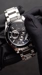 Pánské sportovní bateriové hodinky na ocelovém náramku s motýlkovou sponou. Černý číselník se stopkami a datumovkou je chráněn safírovým sklem. S vodotěsností 100 metrů jsou hodinky vhodné pro plavání a šnorchlování.