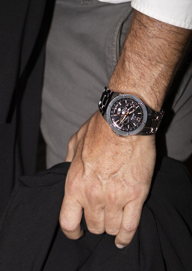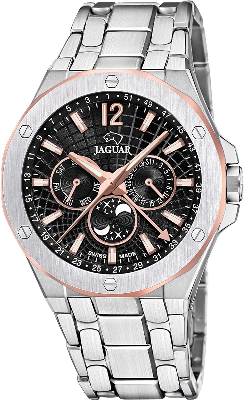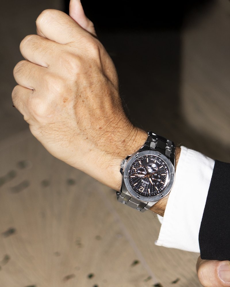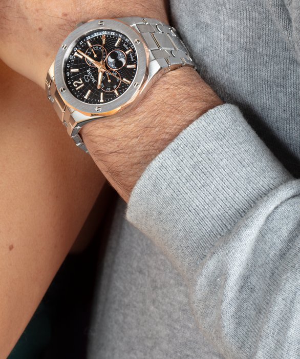 Pánské bateriové hodinky na ocelovém náramku disponují vodotěsností 100 metrů. Černý texturovaný číselník s ukazatelem data, dne v týdnu a měsíční fáze je chráněn safírovým sklem. Zajímavou komplikací po obvodu číselníku je indikátor týdne v roce.