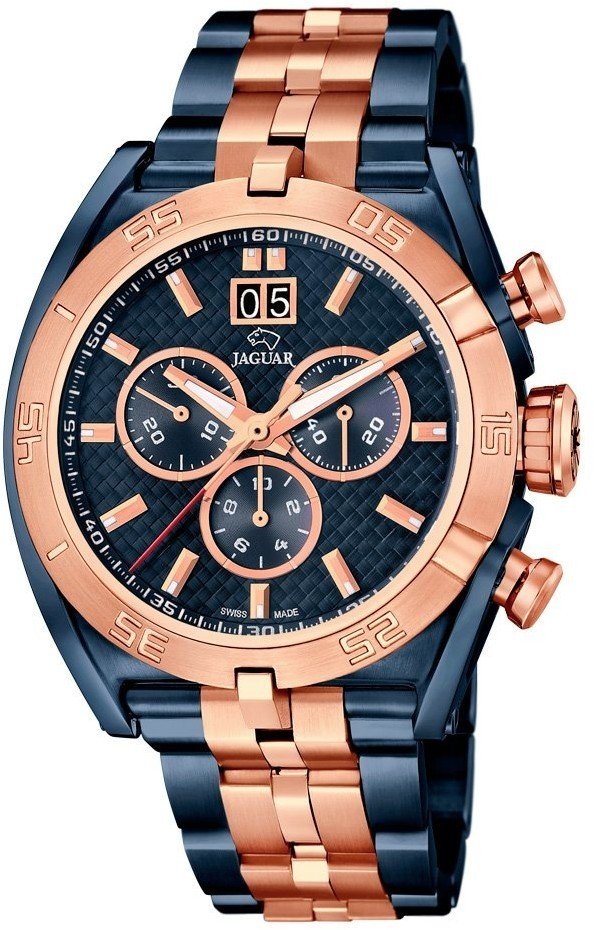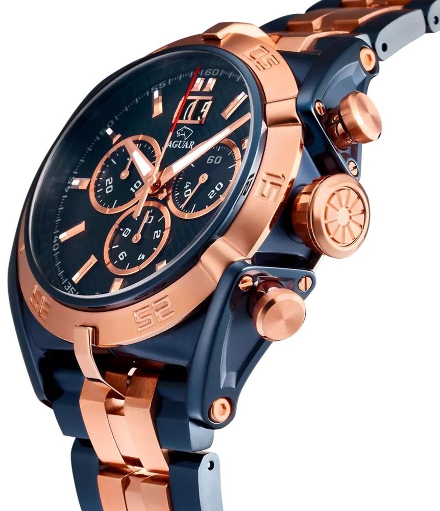 Opravdu speciální model naleznete v pánských hodinkách švýcarské značky Jaguar. Modrý číselník zdobí tři chronografy s funkcí stopek, datumovka a nechybí ani luminiscenční úprava ruček, to vše je kryto safírovým sklíčkem. Částečně zlacené pouzdro i tah je