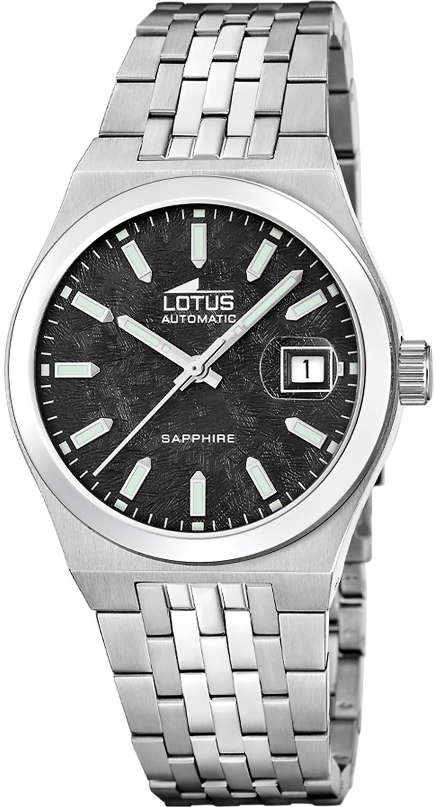 Pánské klasické automatické hodinky na ocelovém náramku vhodné pro každodenní nošení. Černý texturovaný číselník s indikací data je chráněn safírovým sklem odolným proti poškrábání. Hodinky disponují vodotěsností 100 metrů umožňující plavání.