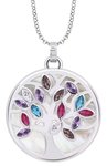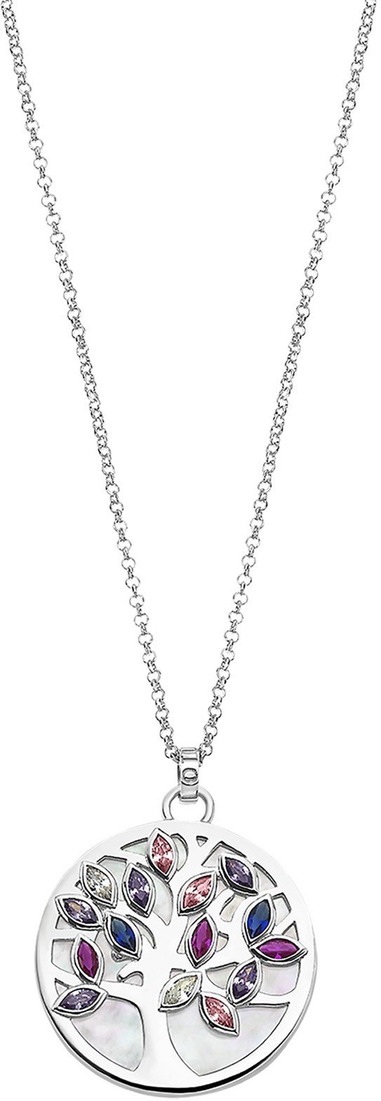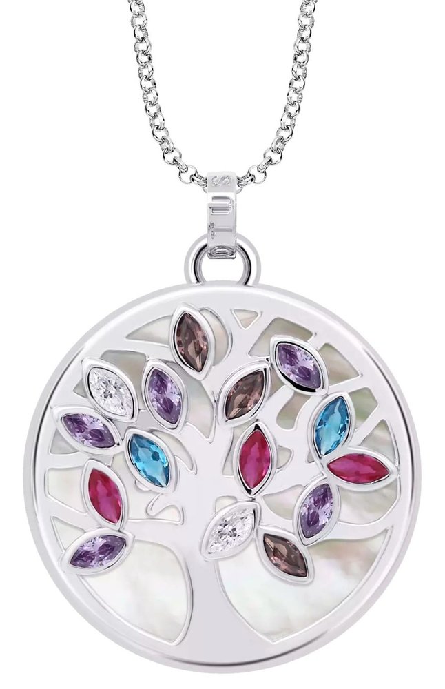 Dámský náhrdelník ze stříbra s přívěškem zdobeným perletí a stromem života, jehož lístky jsou osazeny barevnými zirkony. Šperk značky LOTUS SILVER, stříbro Ag.925 (6,7 g).