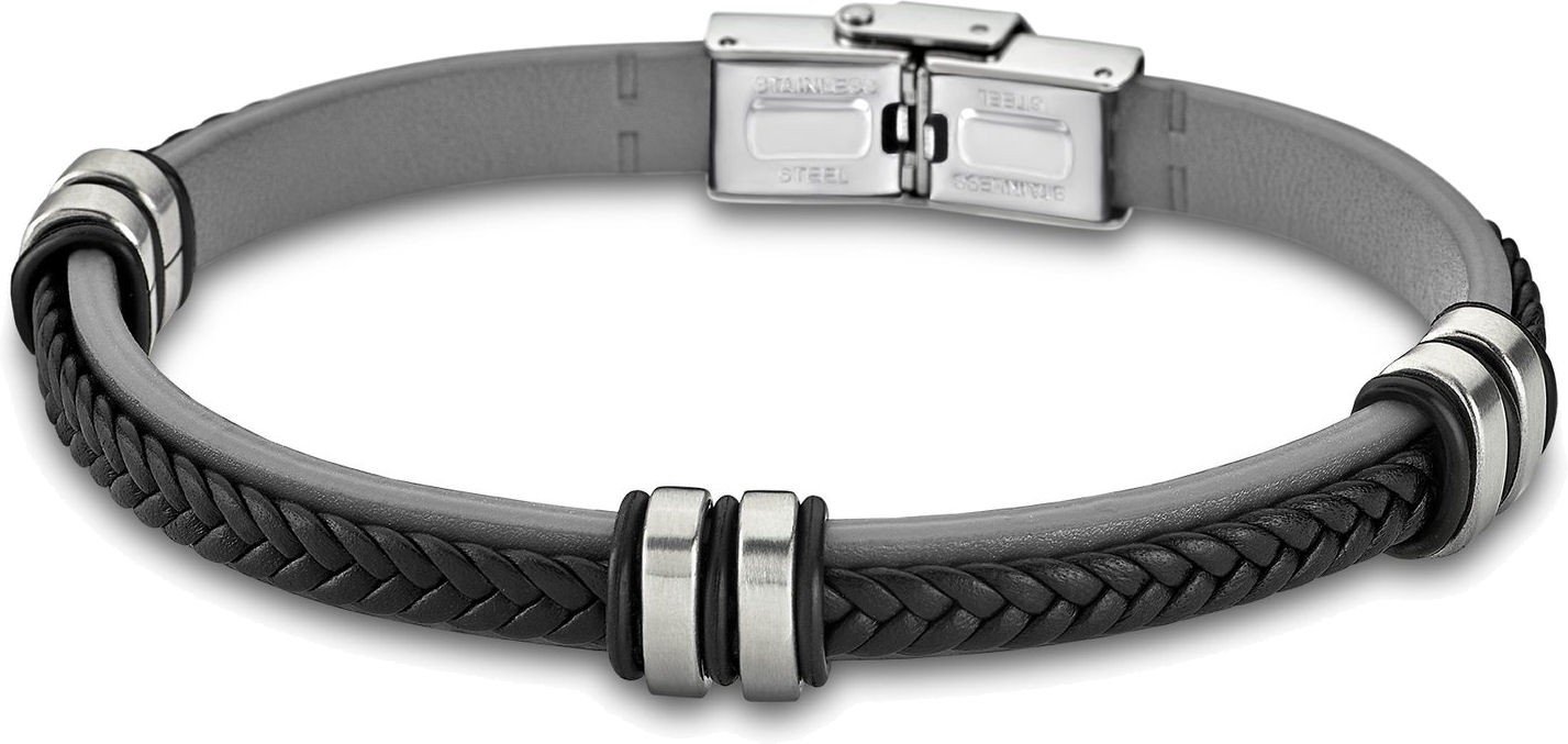 Pánský náramek v kombinaci černé a šedé kůže s ocelí vhodný pro každodenní nošení.